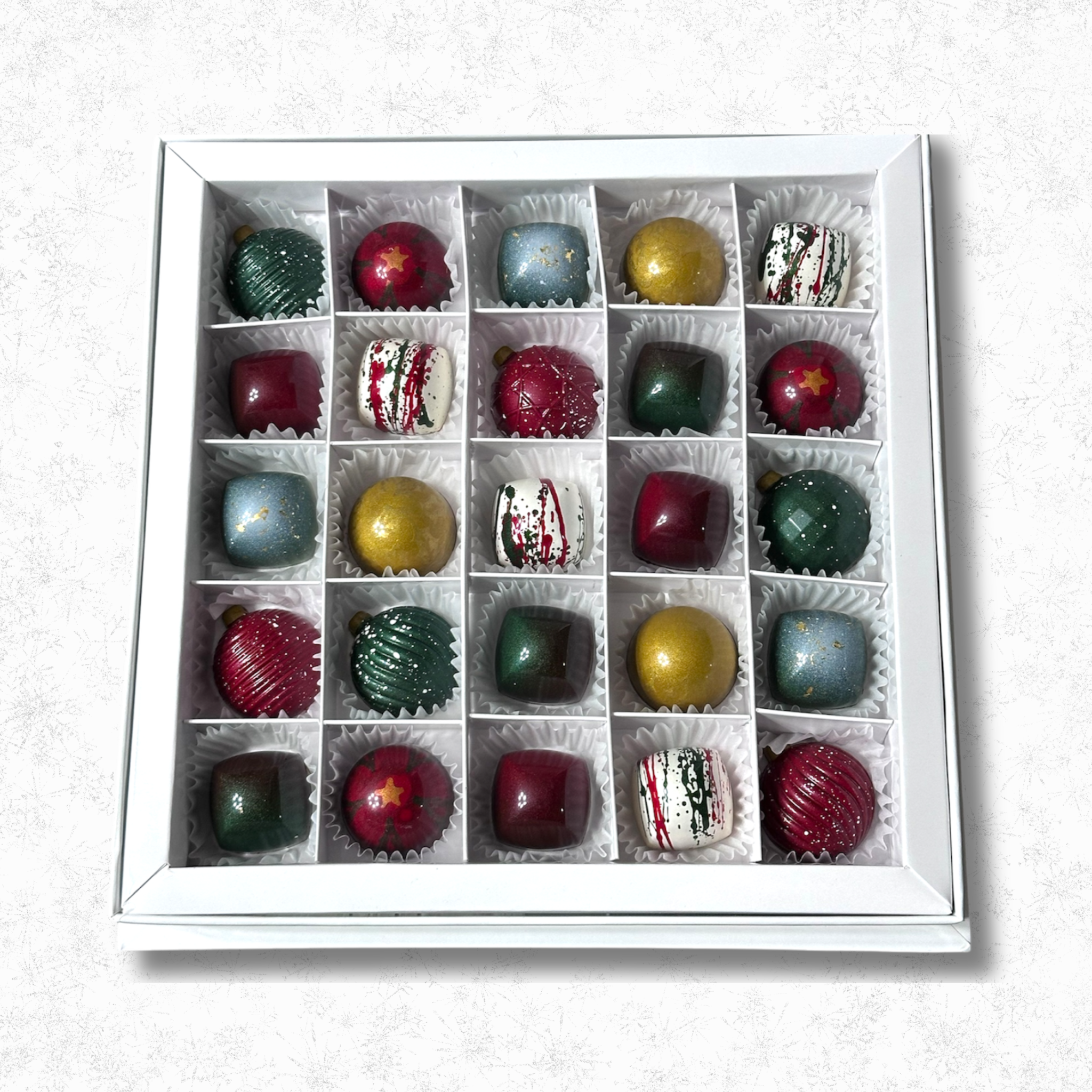 Raise a glass (or a chocolate) to the season with our Holiday Spirit Bonbons — a sparkling assortment crafted for those who believe winter tastes better with a little extra cheer. Nestled in a 9-piece or 25-piece gift box, each bonbon is hand-painted, hand-filled, and made to turn quiet evenings, cozy gatherings, and holiday toasts into something wonderfully indulgent.